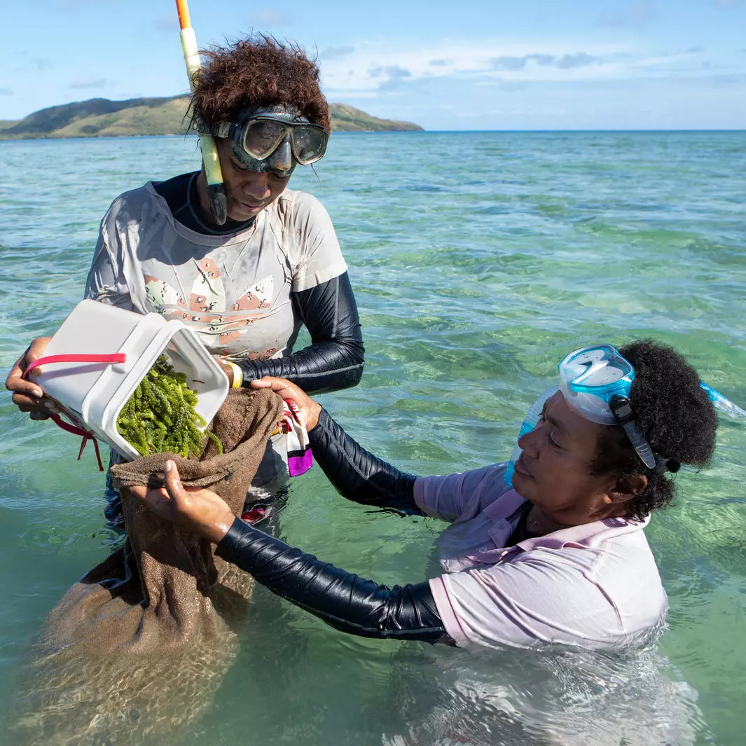 Women harvesters spend up to 8 hours in the water, 3 days a week, hand picking the wild Nama "sea grapes". Nama regenerates rapidly (within 3 - 4 weeks) and harvesting the Nama does not negatively impact the ecosystem. The Nama harvesting program allows the Fijian women to earn an income, learn more here.